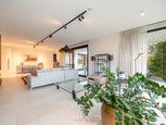 Bij binnenkomst in deze hedendaagse woning wordt u verwelkomd in een ruime en lichte hal. Van hieruit leidt de linker deur u naar de moderne en volledig uitgeruste keuken met kookeiland. De keuken is hoogwaardig afgewerkt met een blad in natuursteen, afzuiging in de kookplaat, bijzonder veel opbergkasten (deeltje moet nog worden geplaatst). Vanuit de keuken heeft men zicht op de naastliggende weilanden en heeft men tevens connectie met de eetruimte en het zitgedeelte. Achter de keuken bevindt zich de technische ruimte, evenals een handige koele berging. Vanuit de technische ruimte heeft men ook toegang tot de tuin. Naast de keuken is er een groot terras voorzien om volop te genieten van buiten bij mooie dagen. De eetruimte bevindt zich ...